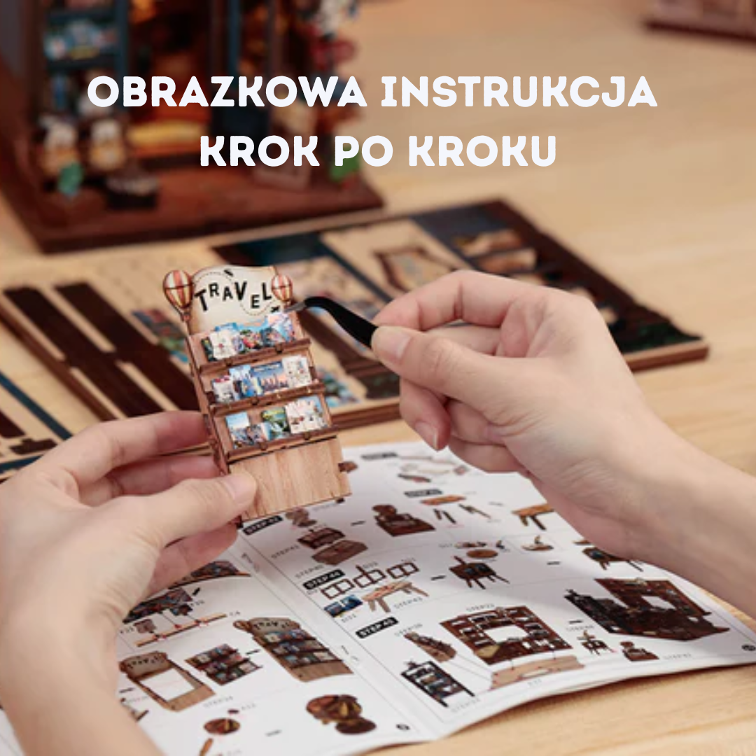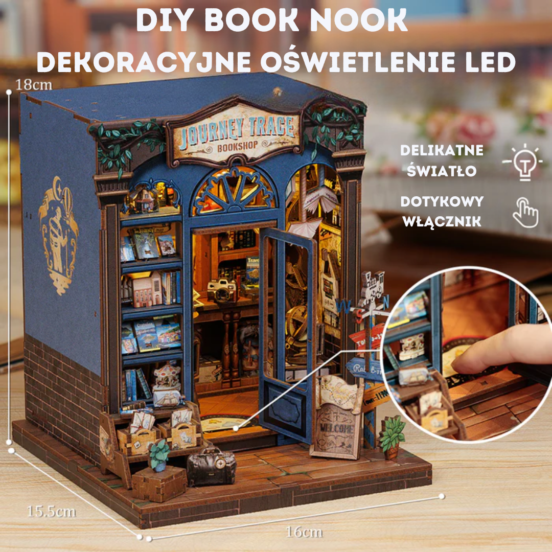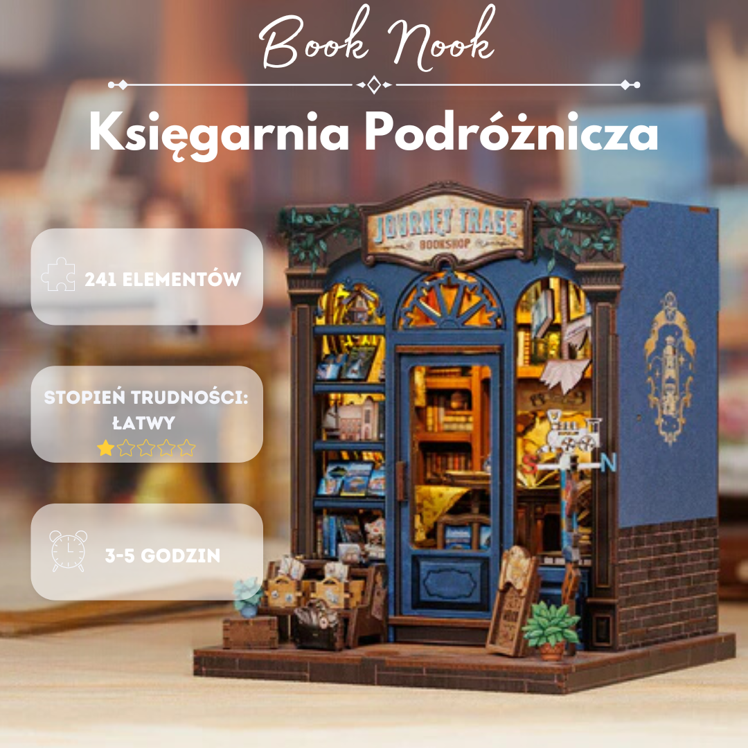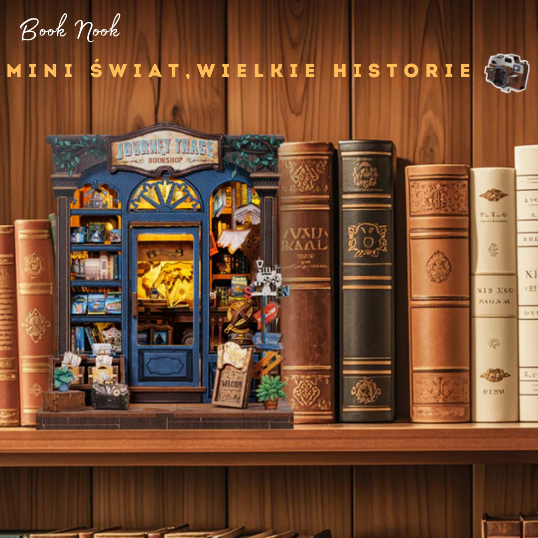 Book Nook Księgarnia Podróżnicza to urocza miniatura księgarni podróżniczej, pełna książek i pamiątek z różnych zakątków świata. Ciepłe światło i bogate detale tworzą atmosferę idealną dla miłośników literatury i podróży. To doskonały dodatek do domowej biblioteki, który przeniesie Cię w świat odkryć i przygód!