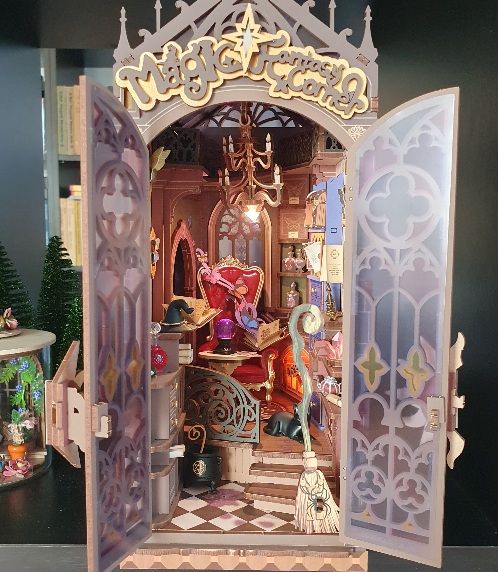 Po złożeniu „Magic Fantasy Corner” staje się efektowną ozdobą między tomami — świetny prezent dla fanów fantasy, book nooków i DIY.