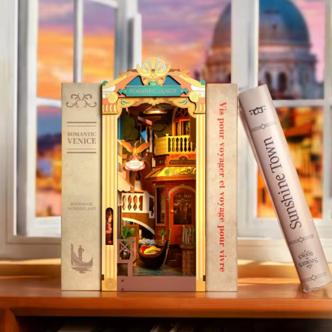 Wsuń kawałek słonecznej Italii pomiędzy swoje książki wraz z Book Nook "Romantyczna Wenecja". To fanatyczny widok na weneckie kanały oraz zabytki w skali mikro . Miniaturowy domek wyposażony jest w subtelne oświetlenie LED.