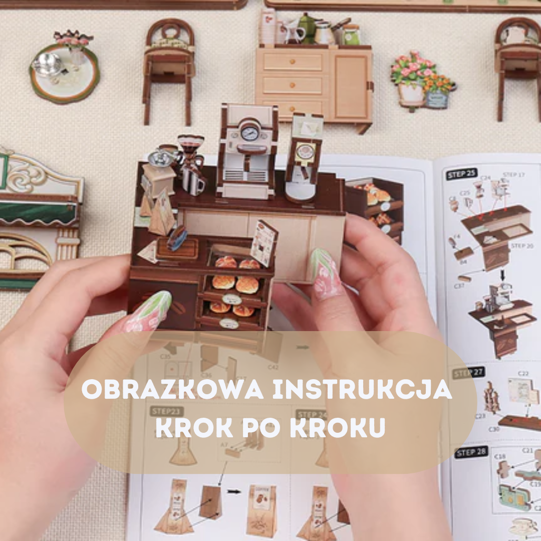 Zatrzymaj czas i stwórz swój własny kącik relaksu. Sunny Café to miniaturowy domek DIY, który zachwyca połączeniem kremowej bieli z retro zielenią, tworząc ciepłą i uspokajającą przestrzeń w stylu vintage. To nie tylko model do złożenia – to mała ucieczka od codzienności, zaklęta w światłach i detalach.