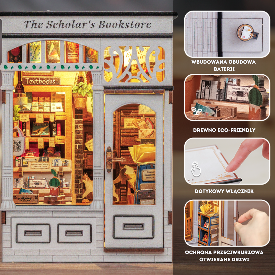 The Scholar's Bookstore to miniaturowy domek DIY, który przenosi Cię do cichego, przytulnego zakątka pełnego książek – od naukowych czasopism po edukacyjne książeczki dla dzieci. To miejsce, w którym nauka spotyka się z codziennym ciepłem, a każda książka otwiera drzwi do nowego świata.