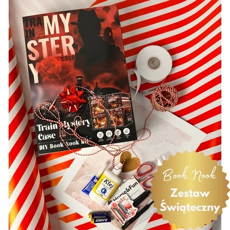 - Świąteczny zestaw DIY „Tajemniczy Pociąg” – Book Nook z klimatycznym LED. W środku: klej typu kropelka, pęseta ukośna, precyzyjne nożyczki, 2× baterie AAA oraz eleganckie pakowanie. Prezent gotowy do wręczenia dla fanów kryminałów i kreatywnego składania.