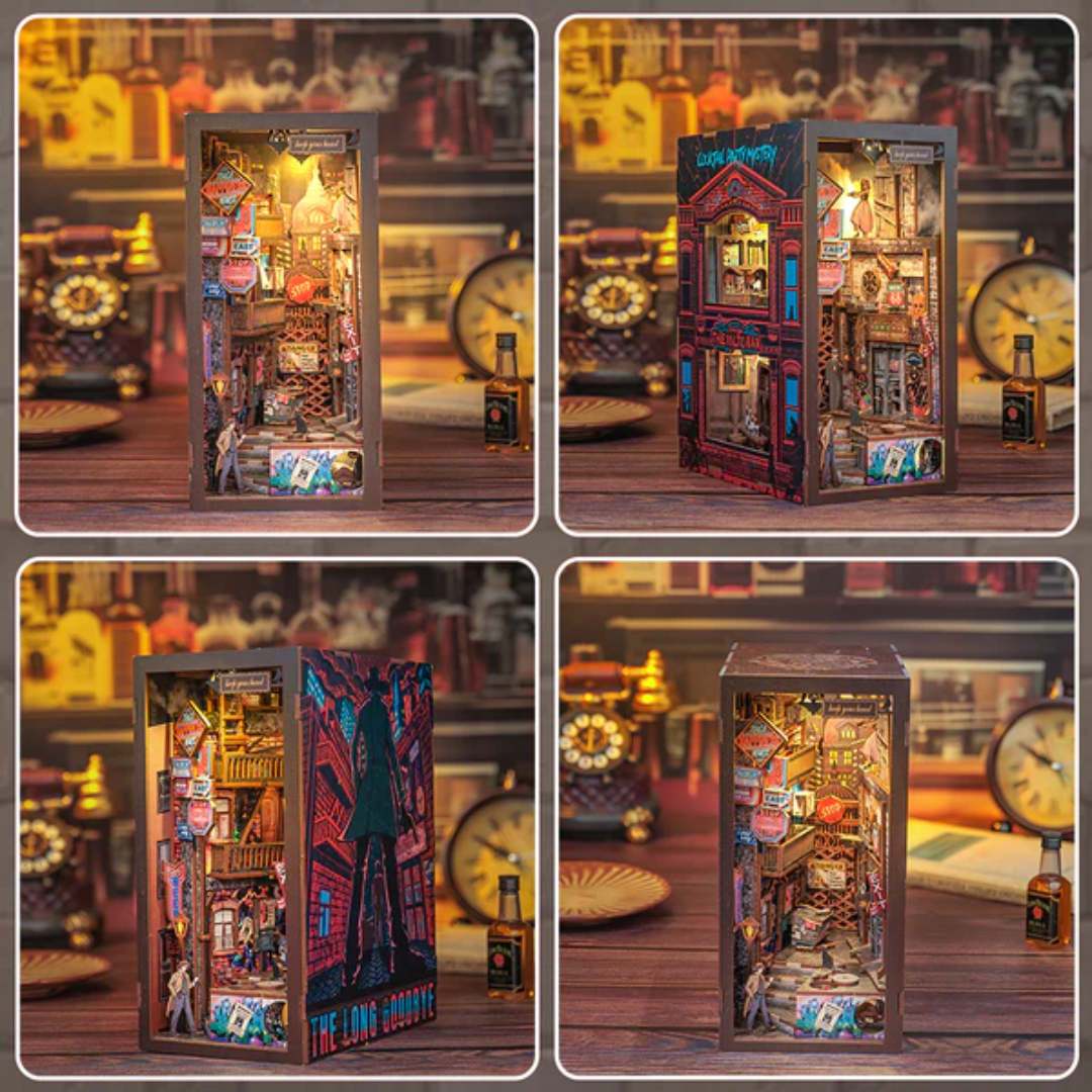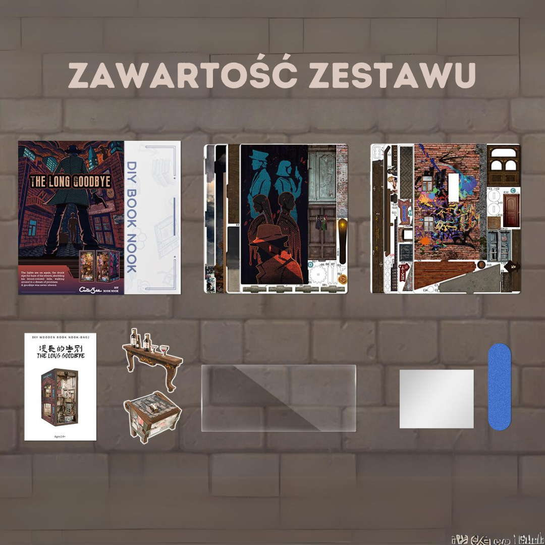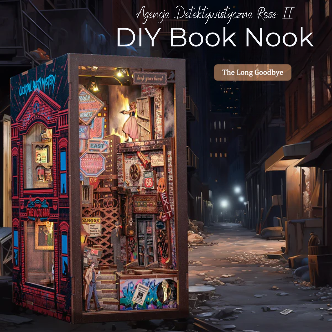 Book Nook "The Long Goodbye" to kolejny domek z serii detektywistycznej. Pierwsza część to Agencja Detektywistyczna Rose. Propozycja idealna dla miłośników kryminałów. Zestaw do samodzielnego złożenia, wyposażony w subtelne oświetlenie LED na baterię. Idealny dla miłośników literatury i wszelkich kreatywnych dusz.